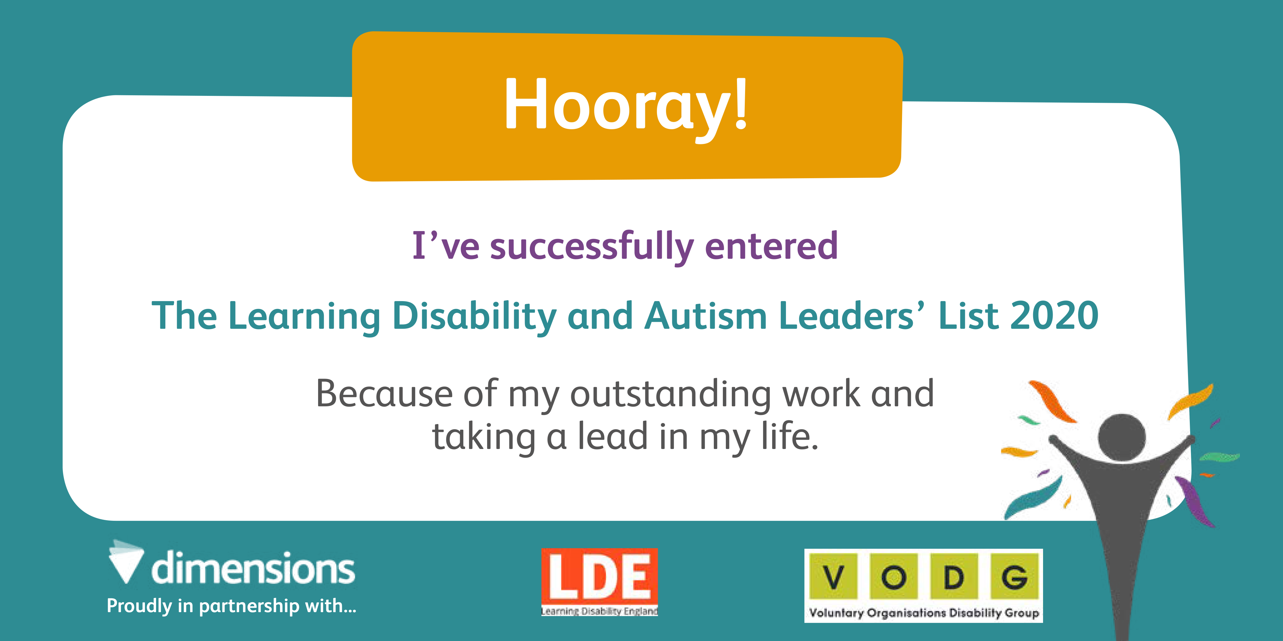 The Dimensions’ Leaders List is a collection of stories from people who has a learning disability and/or autism showcasing their achievements.