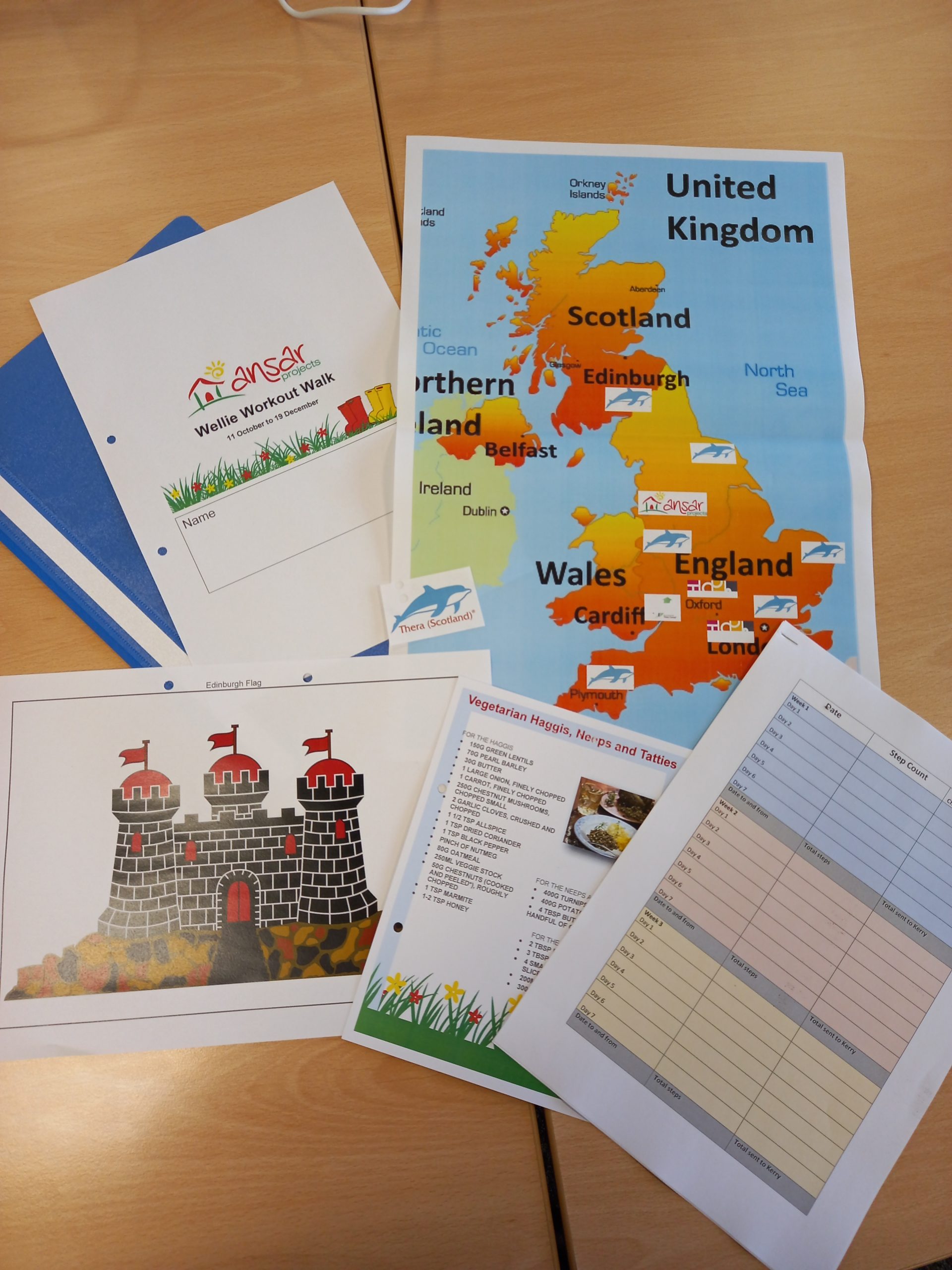 The Wellie Workout Walk is a virtual walk by people supported by Ansar Projects and their staff teams. Wearing step counters, we will walk enough steps each week for us to have walked to a different Thera Subsidiary. Each week, we will hold a virtual event with the company we are walking to which will help us all find out more about the people and places that are part of the Thera Group of Companies. For each section of the event, the people we support receive a sticker to place on a map of the UK, a flag to represent the area of the UK, and a recipe card with a local dish on it.