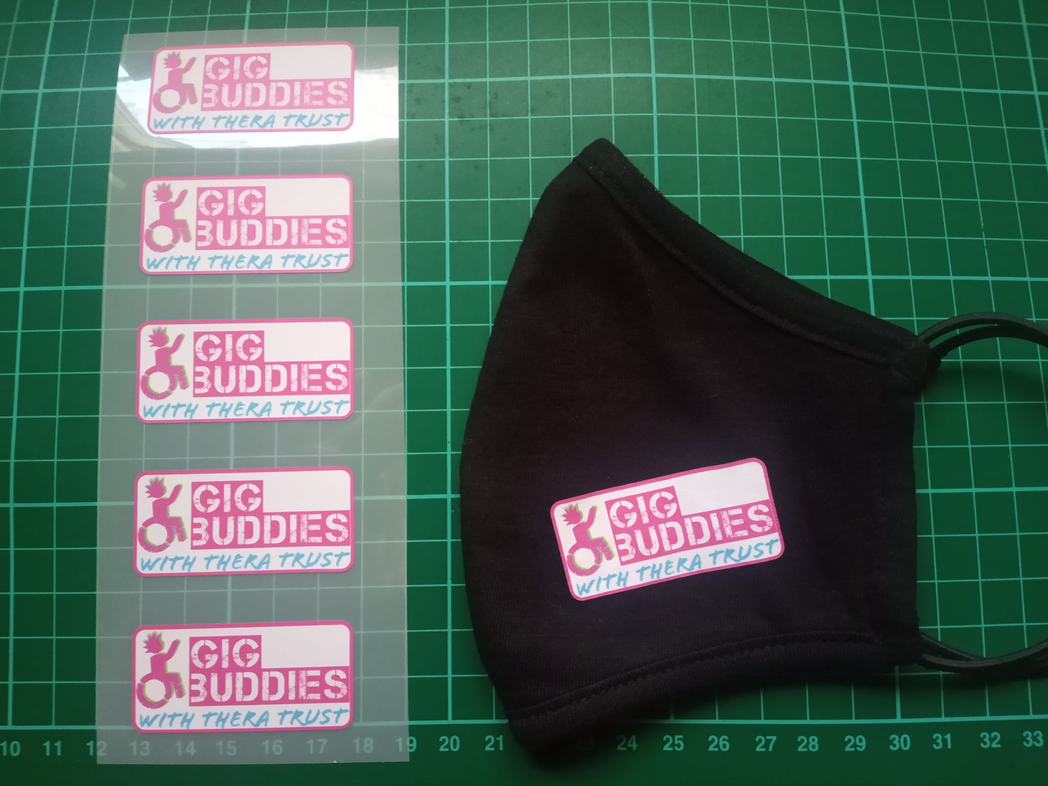 If you would like a mask, send a message to the email address below with the subject ‘Gig Buddies Face Covering‘. We will then send you the link to donate, and post out your face covering. You will receive a black face covering along with an iron-on transfer of our logo and instructions on how to use this.