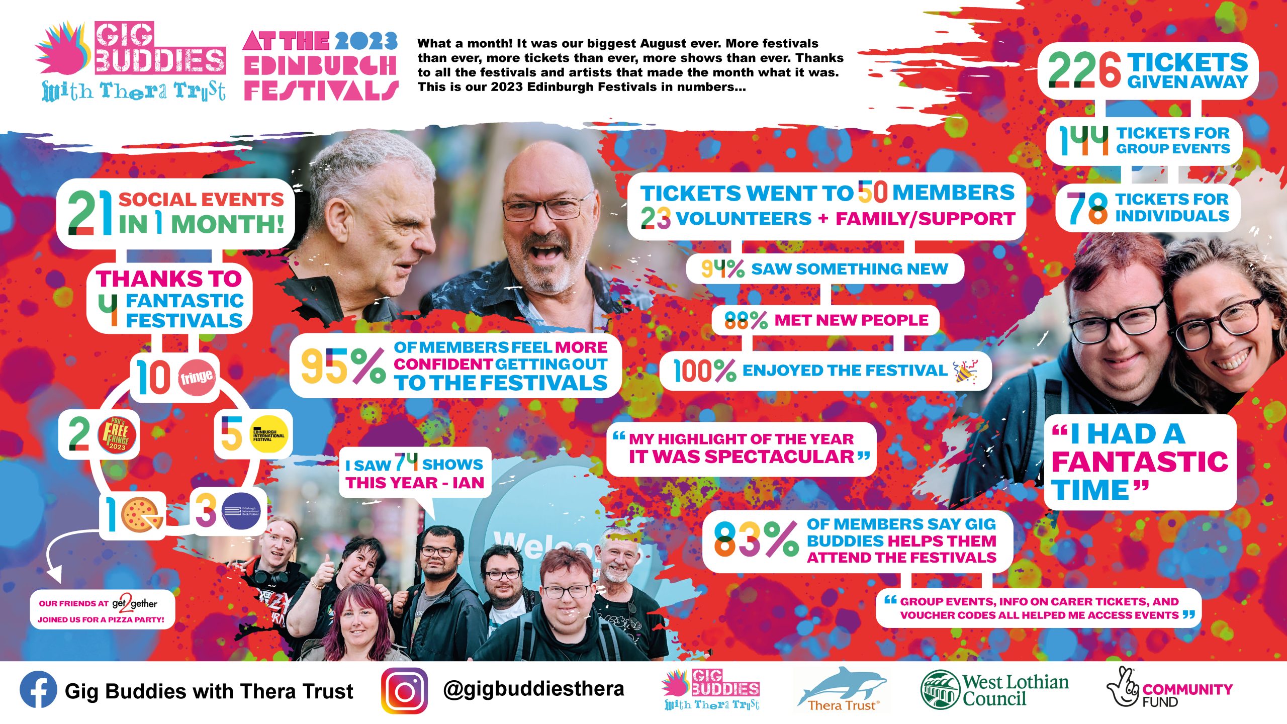 Two of our core outcomes are to enable people to develop social networks, and to feel more confident accessing events in their local community, so we were delighted to find that 88% of members met new people at this years Festival events, while 95% now feel more confident in accessing the Edinburgh Festivals.