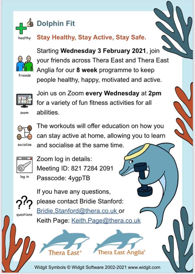 These sessions, nicknamed ‘Dolphin Fit’, run on Zoom every Wednesday with a variety of fun fitness activities for all abilities!